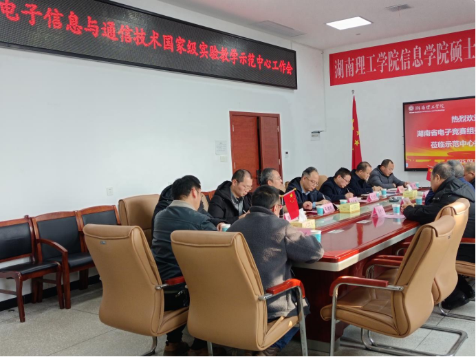 2024年3月7日下午,永利皇宫官方网站电子信息与通信技术国家级实验教学示范中心建设工作推进会在实训楼17517圆满召开。湖南省大学生电子设计竞赛责任专家组组长、湖南大学机器人工程学院黎福海教授,湖南省大学生电子设计竞赛组委会秘书长,湖南科技大学电气工程学院吴新开教授和湖南省电子信息技术研究会副秘书长冯良先生受邀莅临指导,学校党委委员、副校长刘长辉教授、教务处副处长许文苑教授、学院负责人及企业界代表齐聚一堂,共同为实验教学示范中心的高质量发展绘制宏伟蓝图。