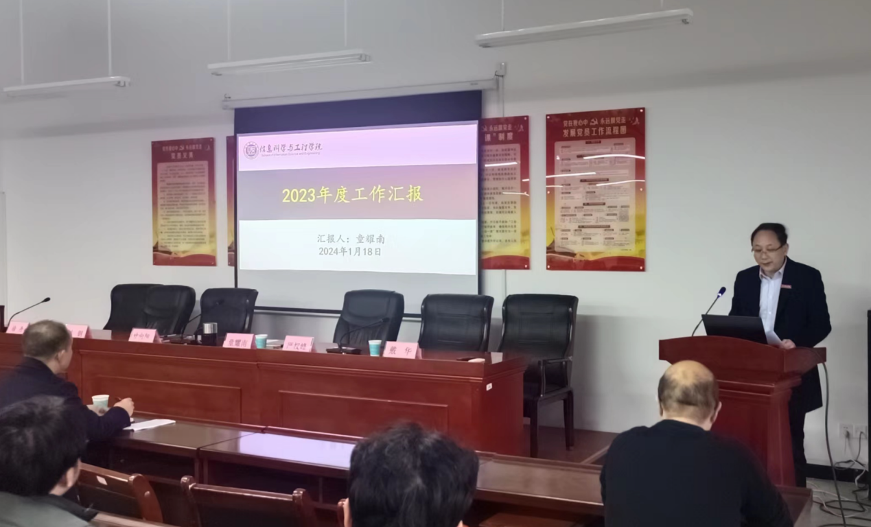 院长童耀南以《稳中求进,厚积薄发,“两进一成三提升”加快推进学院高质量发展》为主题作了学院行政工作及院务公开报告。报告从人才培养捷报频传、学科专业再谱新篇、办会展示信息风采、科研与社会服务再树新高等多方面对学院2023年主要工作进行了总结回顾。人才培养方面2023 届本科毕业生初次就业率达91.19%,排名跃居全校第一,国家级、省级奖项数量分别较上一年度分别增长 90.5%和 43.1%。学科建设方面也取得阶段性重大胜利,电子信息工程专业参加工程教育专业认证完成了为期两年多的自评自建,顺利通过专家评审。学院承办了全国碳基信息器件与先进半导体技术研讨会、第十六届全国信息与电子学科研究生教育学术研讨会、湖南省计算机学会机器视觉与医学影像专业委员会2023年年会暨学术报告会,“软科中国最好学科排名”从去年的92位上升到今年的86 位。在全体老师的共同努力下,学院科研业绩较上一年度增长18.1%