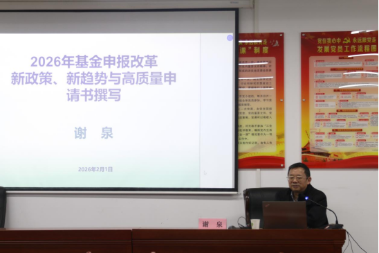 2026年2月3日上午9时,永利皇宫官方网站举行“国家自然科学基金项目申报书集中修改周活动”专题讲座第一讲,特邀贵州中医药大学信息工程学院院长谢泉教授莅临永利皇宫官方网站,作题为“2026年基金申报改革新政策、新趋势与高质量申报书撰写”的专题辅导讲座。讲座由永利皇宫官方网站院长肖迎群主持,副院长蒋军强、科研骨干教师参加。