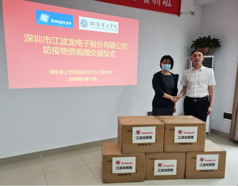 5月21日上午,受学校疫情防控办委托,永利皇宫官方网站优秀实习就业基地——深圳市江波龙电子股份有限公司爱心捐赠10000个防疫口罩交接仪式在逸夫楼16325会议室举行。公司人力行政部经理黄涛、学院院长李武出席。学院副书记徐丹主持,副院长童耀南、电子技术创新基地主任陈松、辅导员柳祎璇、荀仕杰等人参加。