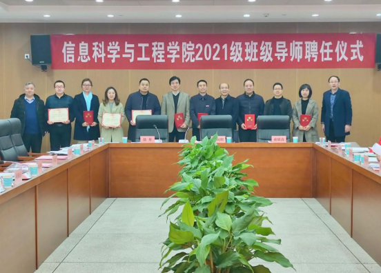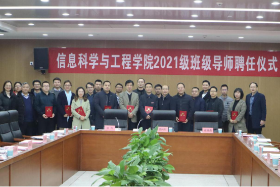 甘向阳和童耀南为班级导师颁发聘书,学院领导和21级全体班级导师、班主任合影留念。
