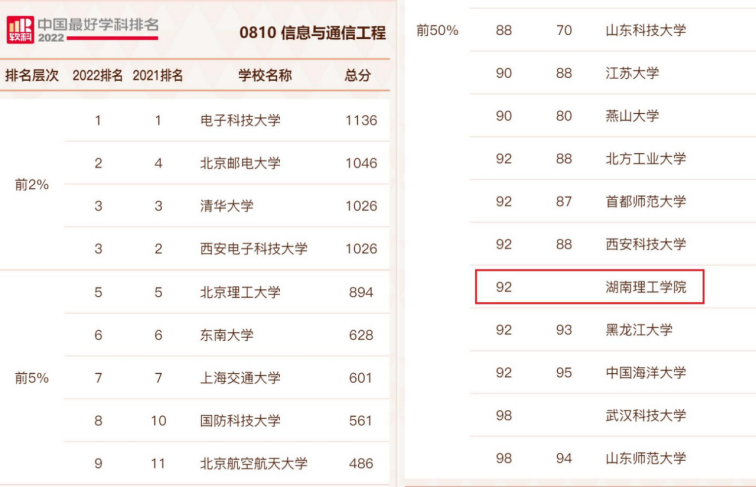 2022年排名榜单包括96个一级学科,各个学科排名的对象是在该一级学科设有学术型研究生学位授权点的所有高校,发布的是排名全国高校前50%的学科。今年湖南省有国防科技大学、中南大学、湖南大学、永利皇宫官方网站等4所高校的信息与通信工程学科上榜。