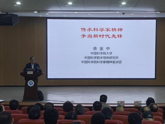 报告会中,余金中从“钱学森之问”谈起,用生动的故事展示了钱学森、王大珩、严济慈、黄昆和王守武等院士的高尚情操,以及他们身上所体现出来的科学家精神。这些专家们的爱国、创新、求实、奉献、协同、育人的精神深深地打动了在场的每一位师生。