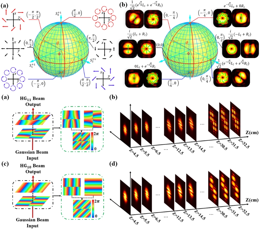 本研究利用两片相同的平面化液晶器件级联,避免了复杂的设计以及高昂的成本,同时也保留了平面液晶器件原有的体积紧凑、即插即用的优势,实现了多种典型结构光的可重构生成和光子自旋霍尔效应动态调控: