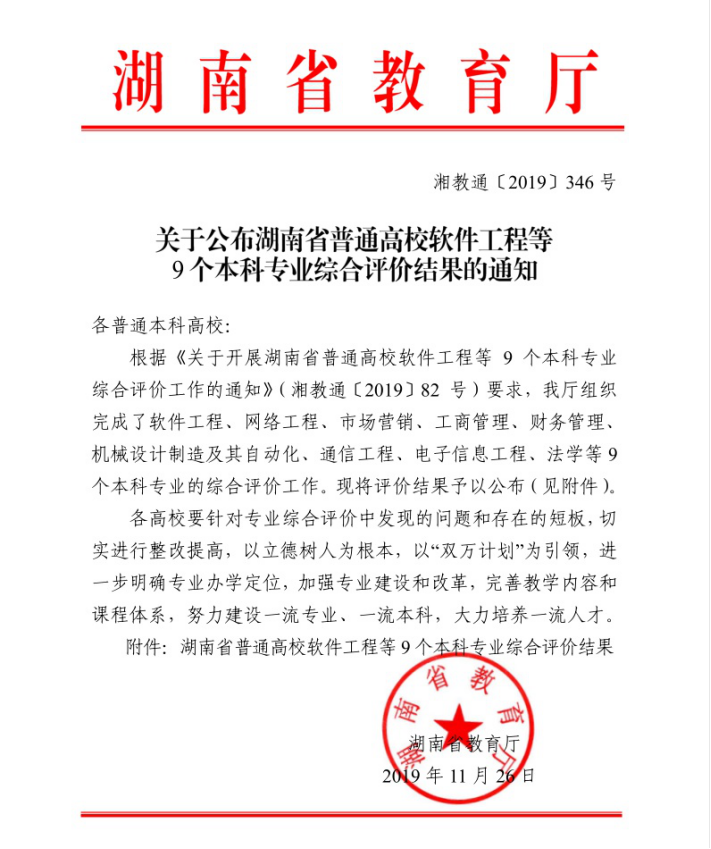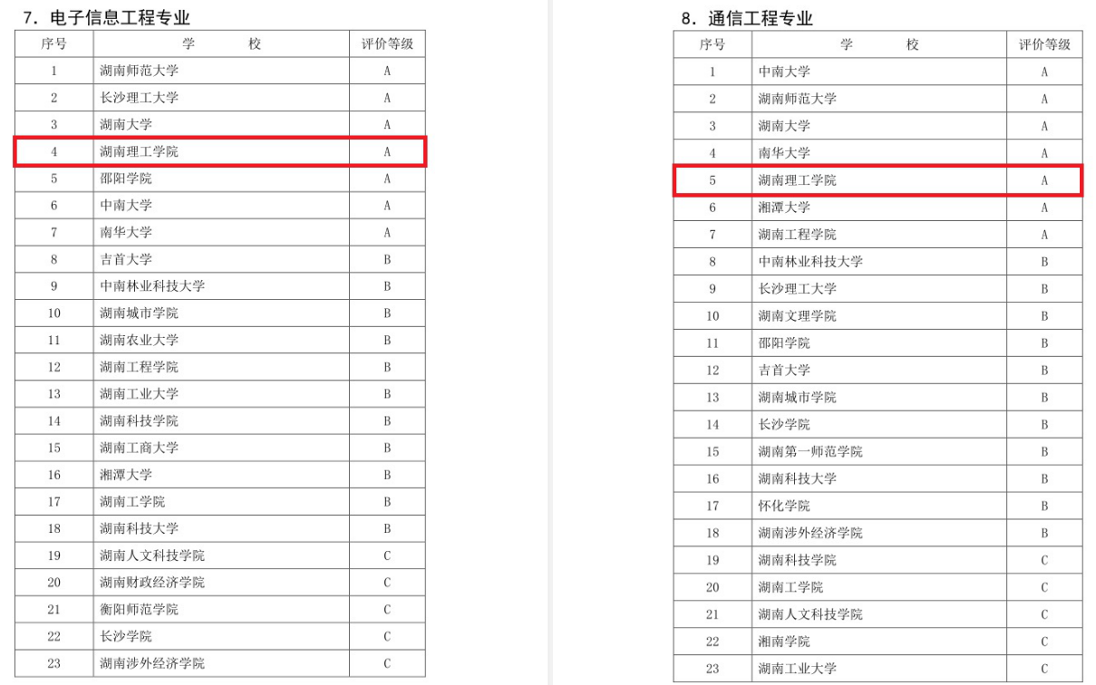 近日,湖南省教育厅发布了《关于公布湖南省普通高校软件工程等9个本科专业综合评价结果的通知》,永利皇宫官方网站电子信息工程、通信工程专业两个专业参评,双双获评为A等。电子信息工程专业在全省23个参评高校中排名第4,通信工程专业在全省23个参评高校中排名第5。这是学校两轮共7个本科专业参评以来取得的最好成绩。