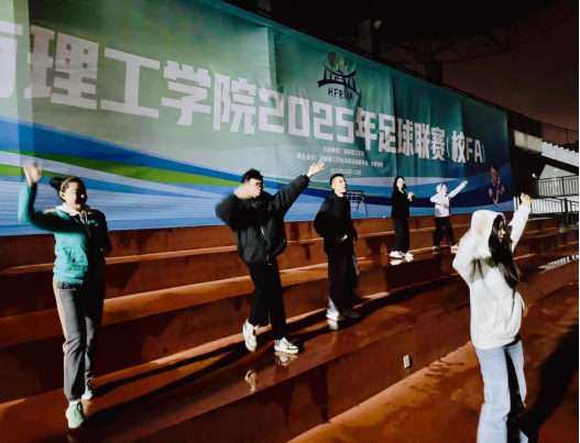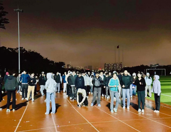 活动现场,荧光与灯光交相辉映,呼声与风声共鸣青春。同学们挥动手中荧光棒,成为校园夜雨中最亮的风景线,轻松愉悦的氛围瞬间弥漫开来。热身环节中,潘昕老师亲自示范,带领全体参与者进行拉伸、转体、高抬腿等跑前热身运动,细致叮嘱运动安全要点,确保每一位同学都能以最佳状态参与后续环节。