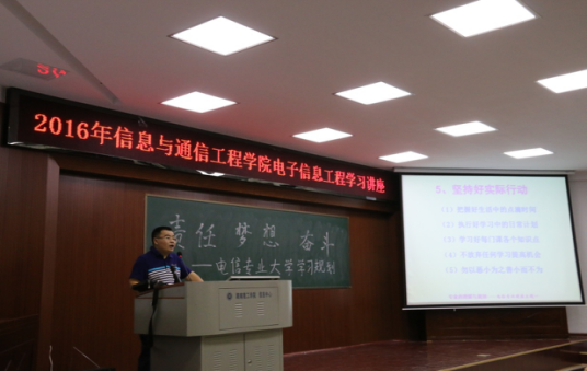 2016年9月27日下午两点半,永利皇宫官方网站电子信息工程专业教研室主任程望斌副教授以 “责任,梦想,奋斗”为主题,针对15级、16级电子信息工程专业学生召开了“大学生规划”专题学习讲座。他主要从对专业的理解与规划、积极参加学科竞赛、勇敢尝试科学研究、把握考研中心任务、共勉的建议与忠告五个方面展开讲解。学习讲座由学生会主席李豪主持。