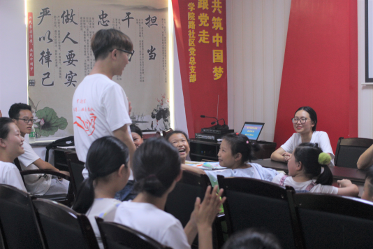 在万物都处于“日轮当午凝不去,万国如在洪炉中”时,永利皇宫官方网站三下乡成员一起徒步抵达学院路社区,由张超和裘寒冰做活动相关宣讲后,爱雏鸟志愿服务团队成员与在座的十名小朋友开始互相自我介绍,随后由“一对一”的形式,各成员与小朋友开始互相交流沟通,志愿服务团队成员幽默风趣的语言使各位小朋友都积极大胆地加入讨论之中,现场气氛一片火热。