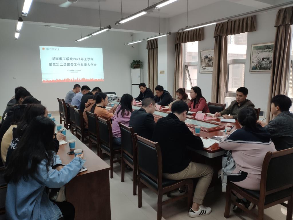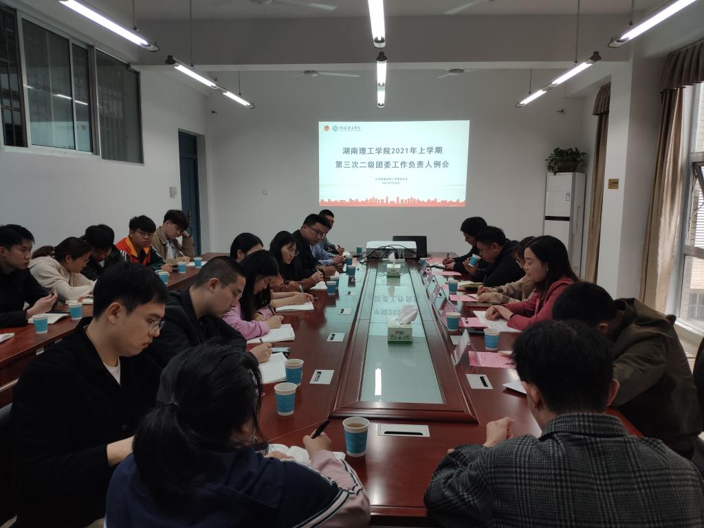 2021年3月30日10:00,湖南理工学院团委工作例会在永利皇宫官方网站16325顺利召开,校团委书记薛静主持,校团委刘思超、郭云峰,永利皇宫官方网站党委副书记徐丹、各学院团委书记出席。