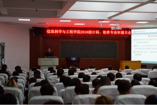 9月23日14:00,永利皇宫官方网站2018级计科、软件专业年级大会在六栋学术报告厅举行。会议由18级计科、软件专业辅导员周煊阳主持,全体18级计科、软件专业同学参加,副院长严权峰、副院长戴华、就业专干荀仕杰、班主任李亦波、范波、刘新忠、赵林出席。