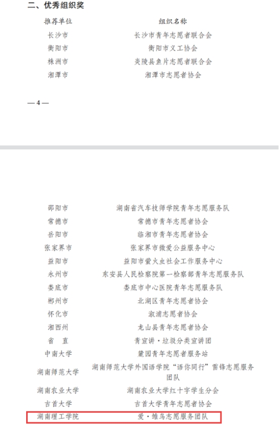 永利皇宫官方网站爱·雏鸟志愿服务团队荣获2022年湖南青年志愿者“优秀组织奖”,此次获奖也是全省学院层次高校唯一获奖单位。