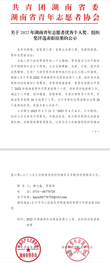 为深入学习宣传贯彻党的二十大精神,贯彻落实习近平新时代中国特色社会主义思想,大力弘扬奉献、互助、进步的志愿精神,引导广大团员青年培育和践行社会主义核心价值观,共青团湖南省委、省青志协联合开展了2022年湖南省青年志愿者优秀个人奖、组织奖评选表彰工作。