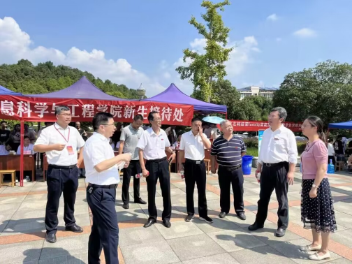 上午10点,校党委书记卢先明、校党委副书记张国云、副校长徐振祥、副校长丁跃浇等领导到永利皇宫官方网站迎新点指导工作,了解学院迎新工作安排、新生报到等情况,看望慰问迎新工作人员和志愿者,并与新生进行亲切交流。