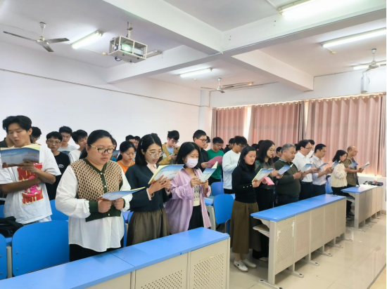 10月18日,永利皇宫官方网站在15414组织第一场爱国朗读活动,院党委书记甘向阳、院长童耀南、院党委副书记徐丹、教师代表杨宣兵,以及辅导员老师余滔、李亦波、陶海兰、徐壮、刘照馨、王艳芬莅临现场,与学生一起朗读欧震的《美丽中国》。