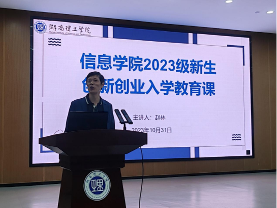 随后,赵林从数字经济时代、大学生创新创业概述、学校创新创业工作简介以及重要创新创业赛事和活动介绍等方面进行讲授,他结合丰富的案例、用幽默的语言、深入浅出地向新生科普创新创业相关知识,并分享创新创业项目开展的思路和方法,引导新生了解创新创业的重要性和机遇。