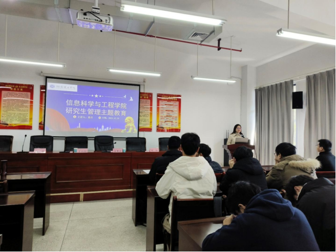 徐丹在研究生管理教育方面提出“五力三问”,五力即政治担当力、团结引领力、工作执行力、难题破解力、形象展示力;三问即是否能静下心来做事、是否有干劲和韧劲、是否追求进步。在学生的思想建设和心理健康方面,徐丹以充满亲和力的语言和生动的案例引导同学们深入探索自己内心的世界,让学生积极面对生活中的挑战和困难,她强调良好的思想建设和心理健康是研究生们成长的基石,期望同学们能够珍惜这一宝贵的成长阶段,努力塑造健全的人格和积极的价值观。