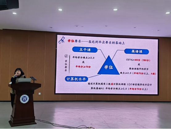 会议开始,刘照馨对转专业和退役复学的新同学们表示欢迎。会上,刘照馨从第一课堂、第二课堂、个人发展、学校日常管理与服务等四个方面与同学们进行交流。她带领同学们一起了解毕业和学位要求,让同学们对大学的学习有更清晰的规划;对第二课堂的学分学时设计、学院评奖评优规则、综合测评细则等进行了介绍,让同学们对自身综合素质的发展方向有了更深刻的认知。