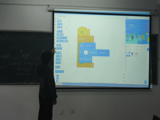 活动伊始,志愿者向小朋友们介绍了编程软件的基本模块,让他们能快速熟悉并使用编程软件。随后,志愿者由大鱼吃小鱼游戏开始深入讲解各种编程模块的使用,着重介绍了角色的移动、角色的变换等编程方法。