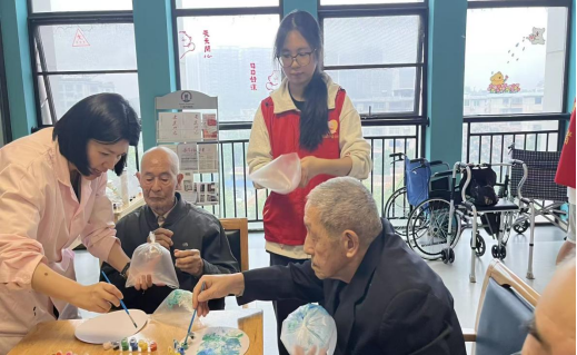 随后开展的“塑料袋拓印画”手工活动,则让老人们化身“艺术家”。志愿者为老人们分发塑料袋、颜料、画纸等材料,并耐心演示拓印技巧——将塑料袋捏出褶皱蘸取颜料,在画纸上轻轻按压,便能呈现出独特的纹理图案。看着一张张充满创意的拓印画在手中诞生,老人们脸上洋溢着满满的成就感。