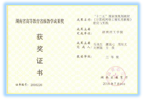 2016年,由永利皇宫官方网站石炎生、郭观七、周细义、刘利强、方欣老师主持完成的“十二五国家级规划教材《计算机网络工程实训教材》建设与实践”项目获第十三届湖南省高等教育省级教学成果三等奖。该成果表明了永利皇宫官方网站在教材建设方面的成效。