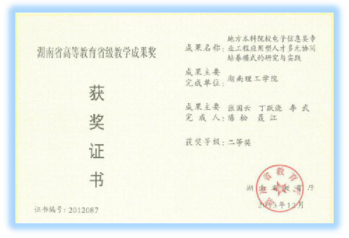 2013年,由永利皇宫官方网站张国云、丁跃浇、李武、陈松等教师主持完成的“地方本科院校电子信息类专业工程应用型人才多元协同培养模式的研究与实践”项目获第十届湖南省高等教育省级教学成果二等奖。该成果表明了我院长期坚持地方性、应用型办学定位的准确性,充分肯定了永利皇宫官方网站在高素质工程应用型人才培养方面的成绩。