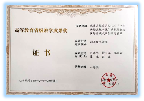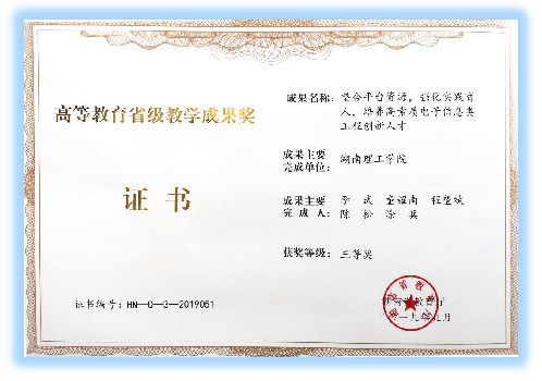 2019年9月23日,省教育厅公布《关于公布第十二届湖南省高等教育教学成果奖获奖项目的通知》(湘教通〔2019〕294号),永利皇宫官方网站李武教授主持完成的“整合平台资源,强化实践育人,培养高素质电子信息类工程创新人才”荣获教育教学成果三等奖,永利皇宫官方网站张国云、彭鑫参与完成的“地方高校应用型人才‘一体两轮三核四优’产教融合协同培养模式的创新与实践”荣获一等奖。