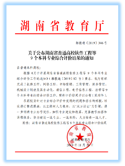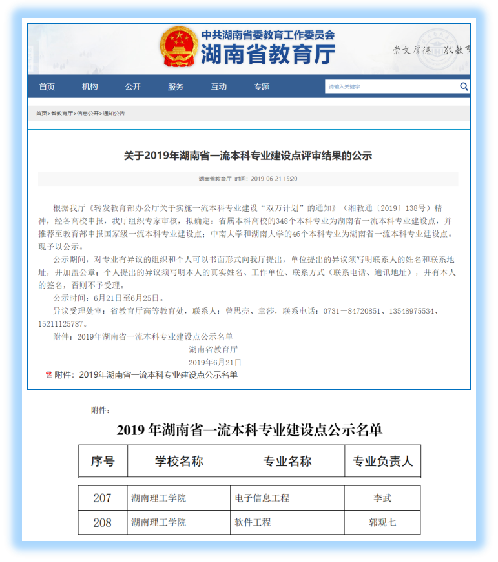 2019年6月,教育厅发布了关于2019年湖南省一流本科专业建设点评审结果的公示,永利皇宫官方网站电子信息工程专业和软件工程专业经学校推荐、省厅专家组评审,拟立项为省级一流本科专业建设点。两个省级一流本科专业建设点的立项,表明永利皇宫官方网站专业改革举措和成效得到了省内专家和政府教育主管部门的认可,也将为永利皇宫官方网站专业建设和人才培养改革掀开新篇章。