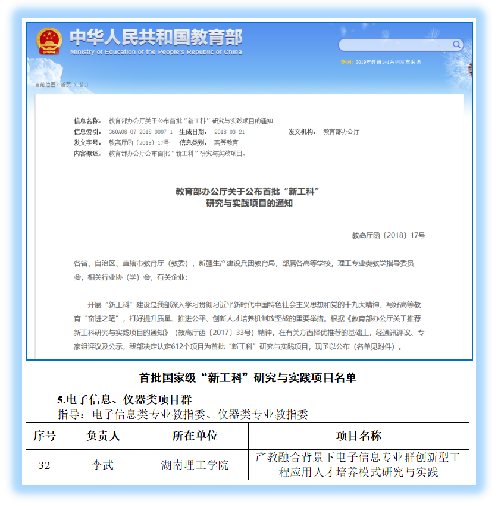 2018年3月,教育部公布了首批国家级新工科研究与实践项目名单。在学校精心组织、省教育厅评审推荐的基础上,经教育部组织通讯评议及专家组评议,永利皇宫官方网站院长李武教授主持申报的“产教融合背景下电子信息专业群创新型工程应用人才培养模式研究与实践”项目获批立项。本次获批的国家级新工科项目,是永利皇宫官方网站在多年围绕工程应用型人才培养开展专业建设和人才培养模式改革的成果基础上取得的又一重大突破。