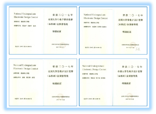 在2019年全国大学生电子设计竞赛中,永利皇宫官方网站学生斩获全国一等奖3项、二等奖2项。一等奖数量居湖南省高校首位,并列全国第15位,是全国本科组获得3项及以上一等奖的2个学院级别高校之一。