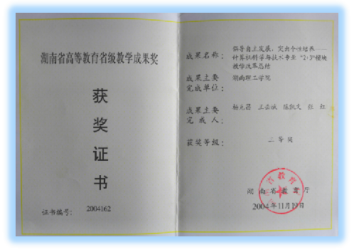 2004年,由永利皇宫官方网站杨克昌、王岳斌、陈凯文、张红等老师主持完成的“倡导自主发展,突出个性培养----计算机科学与技术专业‘2+3’模块教学改革”项目获第四届湖南省高等教育省级教学成果三等奖。该成果充分表明了永利皇宫官方网站在计算机科学与技术专业教学改革方面的成效。