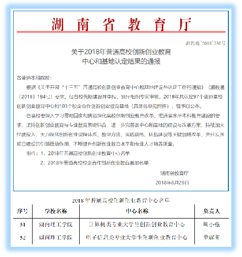 2018年8月,教育厅发布了关于2018年普通高校创新创业教育中心和基地认定结果的通报,永利皇宫官方网站计算机类专业大学生创新创业教育中心和电子信息类专业大学生创新创业教育中心均获批为省级中心,分别由周小强和童耀南任中心主任。两个省级中心的认定,表明永利皇宫官方网站大学生创新创业教育硬件条件、师资水平、人才培养成效等获得政府教育主管部门的充分肯定。