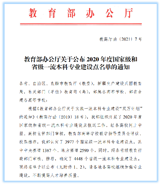 2021年2月,教育部办公厅发布了2020年国家级和省级一流本科专业建设点名单,永利皇宫官方网站计算机科学与技术专业获批为国家级一流本科专业建设点,通信工程专业获批为省级一流本科专业建设点。至此,永利皇宫官方网站共有4个本科专业进入省级、国家级一流专业建设名单,占全院在招生本科专业总数(6个)的66.7%。
